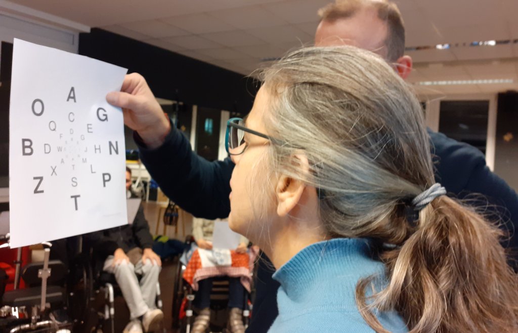 Foto: Visuelle Übung zum Training des Gesichtsfeldes: Man fixiert die kleinst lesbaren Buchstaben in der Blattmitte und versucht (ohne die Augen zu bewegen!!), die äußeren Buchstaben zu lesen. Wer diese nicht alle erkennen kann, hat zwangsläufig Mängel im Gleichgewichtssystem, das auch mit solch einer Übung trainiert werden kann.