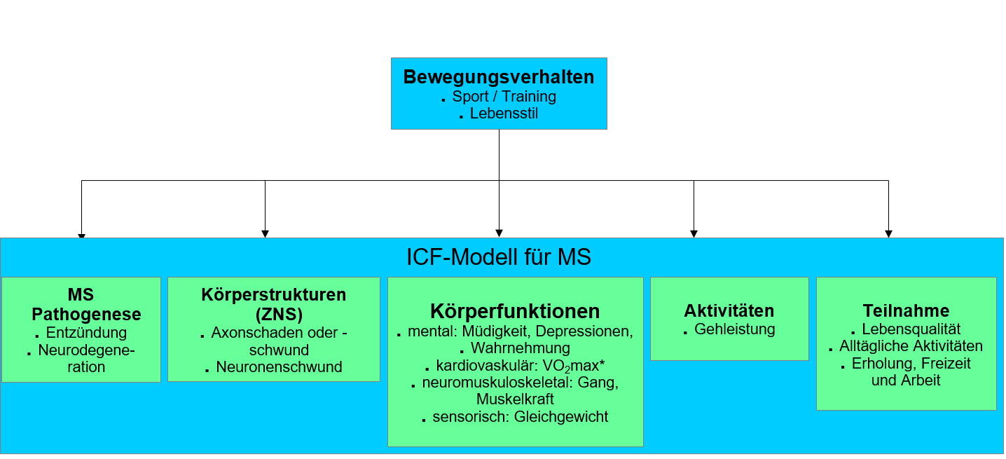 Die obige Abbildung (ICF-Modell) versucht die Zusammenhänge zwischen dem Bewegungsverhalten (Sport, Training und Lebensstil) und der MS-Pathogenese (Entstehung und Entwicklung der MS mit allen daran beteiligten Faktoren) bildlich zu verdeutlichen. Das ICF-Modell skizziert die Konsequenzen der MS-Pathogenese, einschließlich der Effekte auf Körperstrukturen und -funktionen sowie auf Aktivität und gesellschaftlicher Teilnahme des Patienten. Bewegung kann positive Effekte auf all diese Bereiche haben, vom Einfluss auf zelluläre Prozesse (z.B. Entzündungshemmung) bis hin zu verbesserter Teilhabe des Patienten an sozialen Interaktionen.