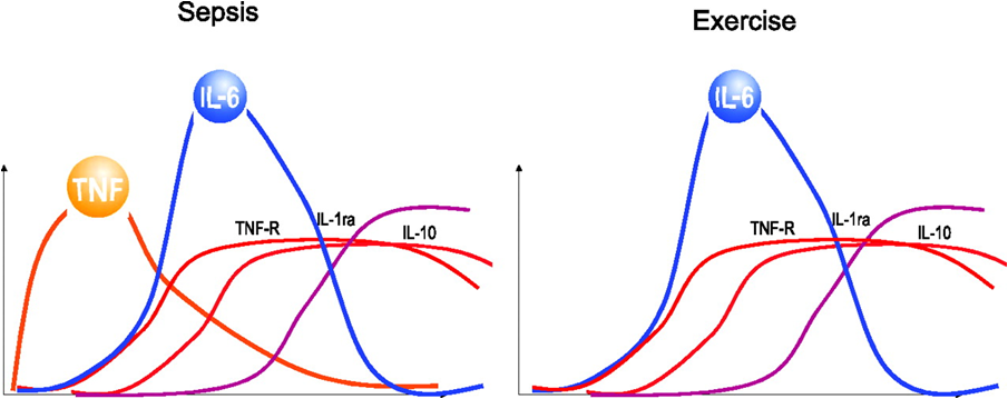 Vergleich des Sepsis-induzierten verus Übungs-induzierten Anstiegs der zirkulierenden Zytokine. Während der Sepsis kommt es zu einem deutlichen und raschen Anstieg des zirkulierenden Tumornekrosefaktors (TNF) -α, dem ein Anstieg des Interleukins (IL) -6 folgt. Im Gegensatz dazu ist der deutlichen Zunahme von IL-6 während des Trainings kein erhöhtes TNF-α vorangestellt [2].