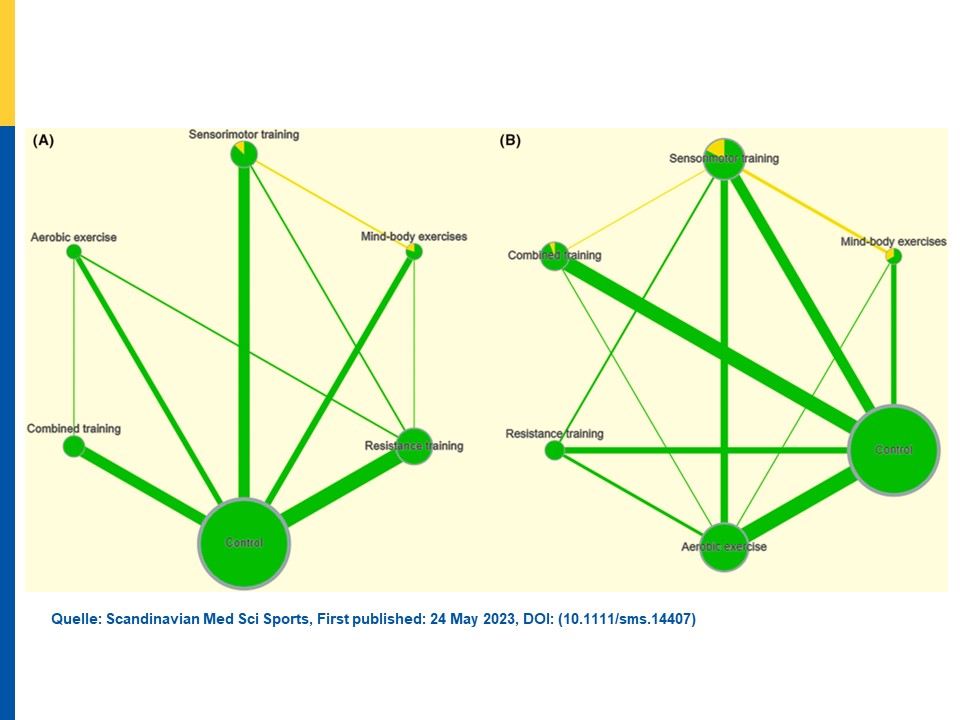 Das Bild zeigt das Netzwerk der verfügbaren Vergleiche zwischen verschiedenen Arten von Trainingsmaßnahmen zur Fitness bei Multipler Sklerose: (A) muskuläre Fitness; (B) kardiorespiratorische Fitness.